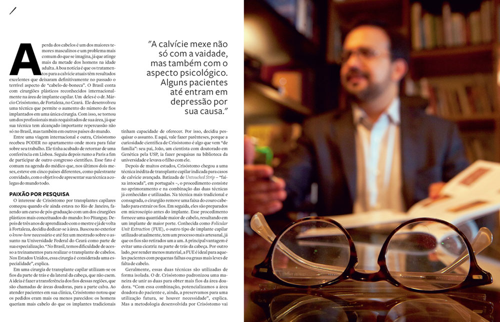 O interesse de Crisóstomo por transplantes capilares começou quando ele ainda estava no Rio de Janeiro, fazendo um curso de pós-graduação com um dos cirurgiões plásticos mais conceituados do mundo: Ivo Pitanguy. Depois de três anos de aprendizado com o mestre e já de volta à Fortaleza, decidiu dedicar-se à área. Buscou no exterior o know-how necessário e até fez um mestrado sobre o assunto na Universidade Federal do Ceará como parte de sua especialização. “No Brasil, temos dificuldade de acesso a treinamentos para realizar o transplante de cabelos. Nos Estados Unidos, essa cirurgia é considerada uma especialidade”, explica.